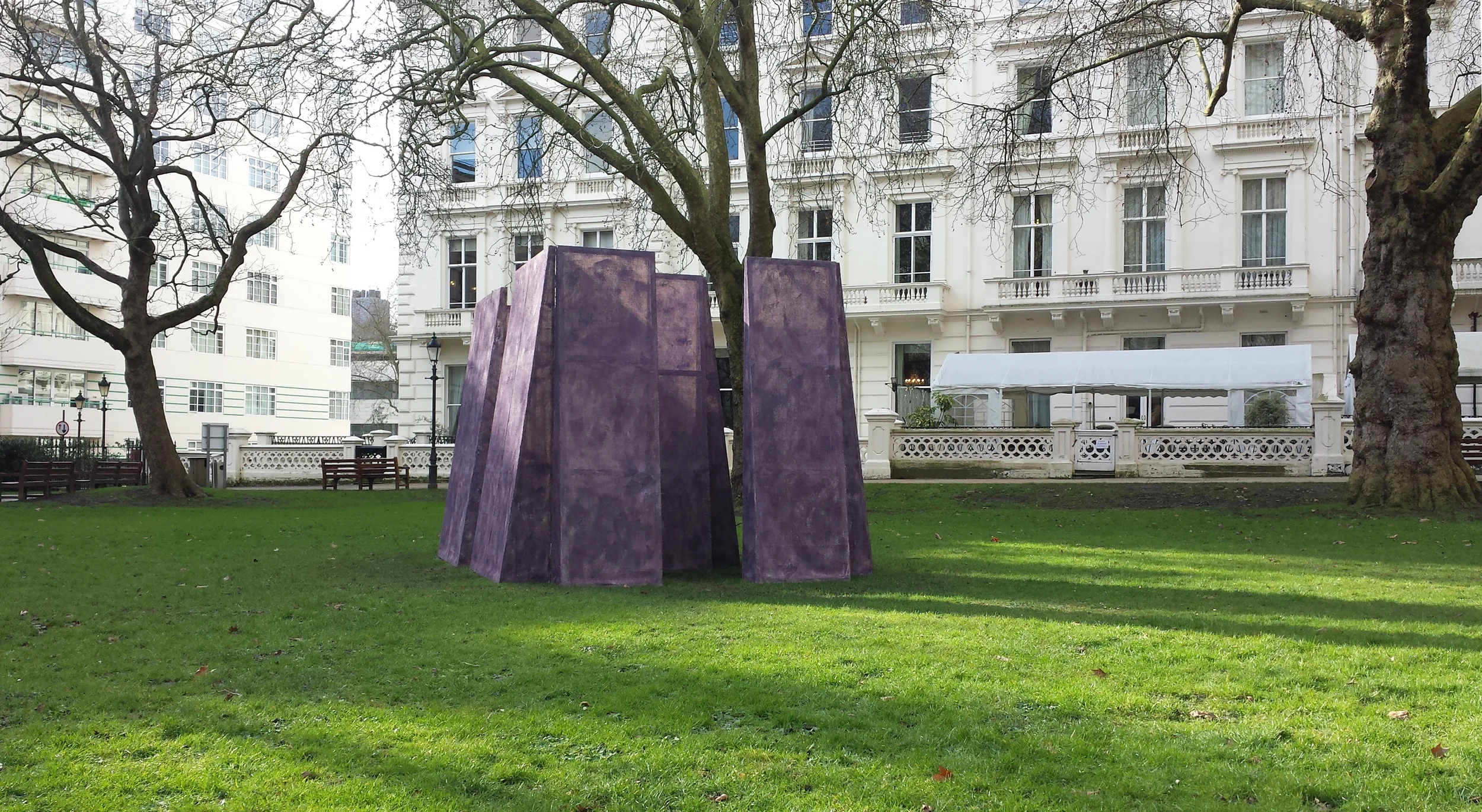 Within the square near the south entrance to Exhibition Road is the installation site for the over life size sculpture Labyrinth. As one walks around the work to view it from a distance, one finds its form and depth change constantly and gets the feeling of its enclosure, the inner space with help from walls opening, entrances or exits and the see through hessian walls. It has been stated that I “choreograph the viewer’s movements and experience, diverting the focus points and resisting the notion of a full overview”. I invite people on a journey to enter the seven wall structure or to just ignore it. On that journey one will have to go out of one’s way from the path to enter the Labyrinth where it expresses it’s being both by form and name.